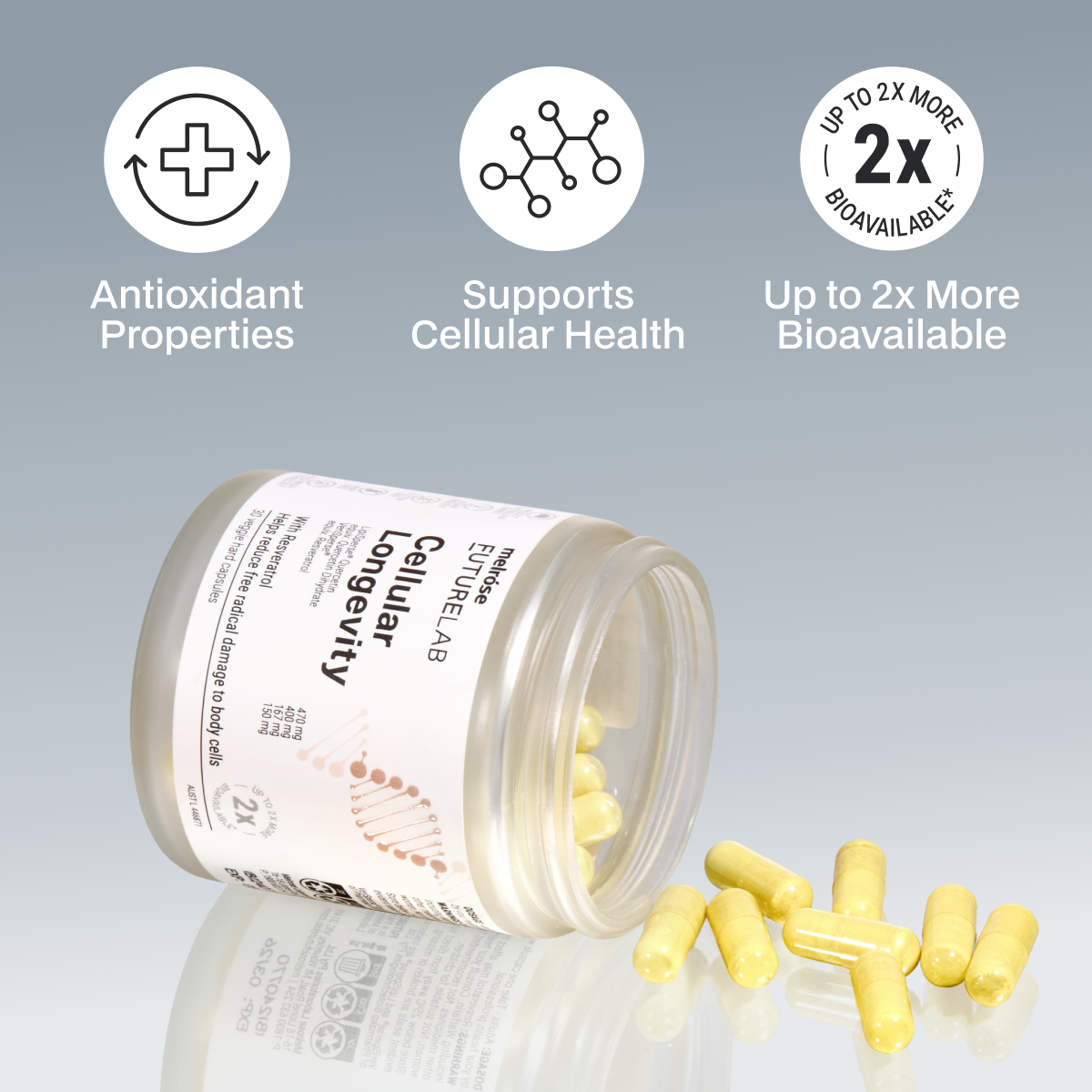 Melrose FutureLab Cellular Longevity features a premium blend of Resveratrol and Quercetin, two antioxidant nutrients known to help combat oxidative stress and support health at a cellular level. As oxidative stress increases with age, these antioxidants help protect the body by reducing free radicals formed in the body.