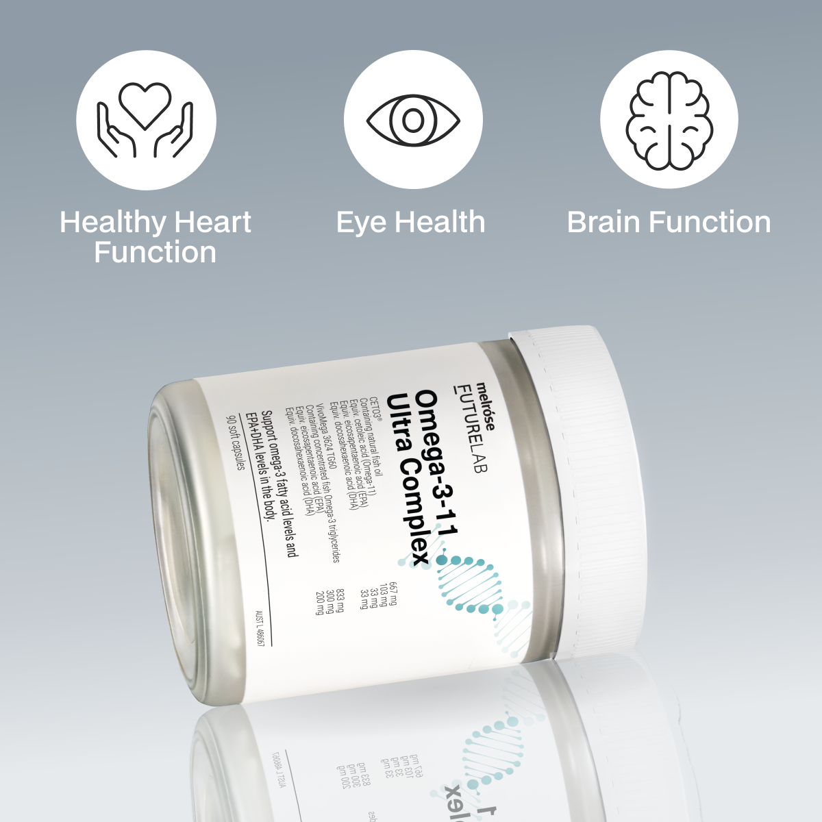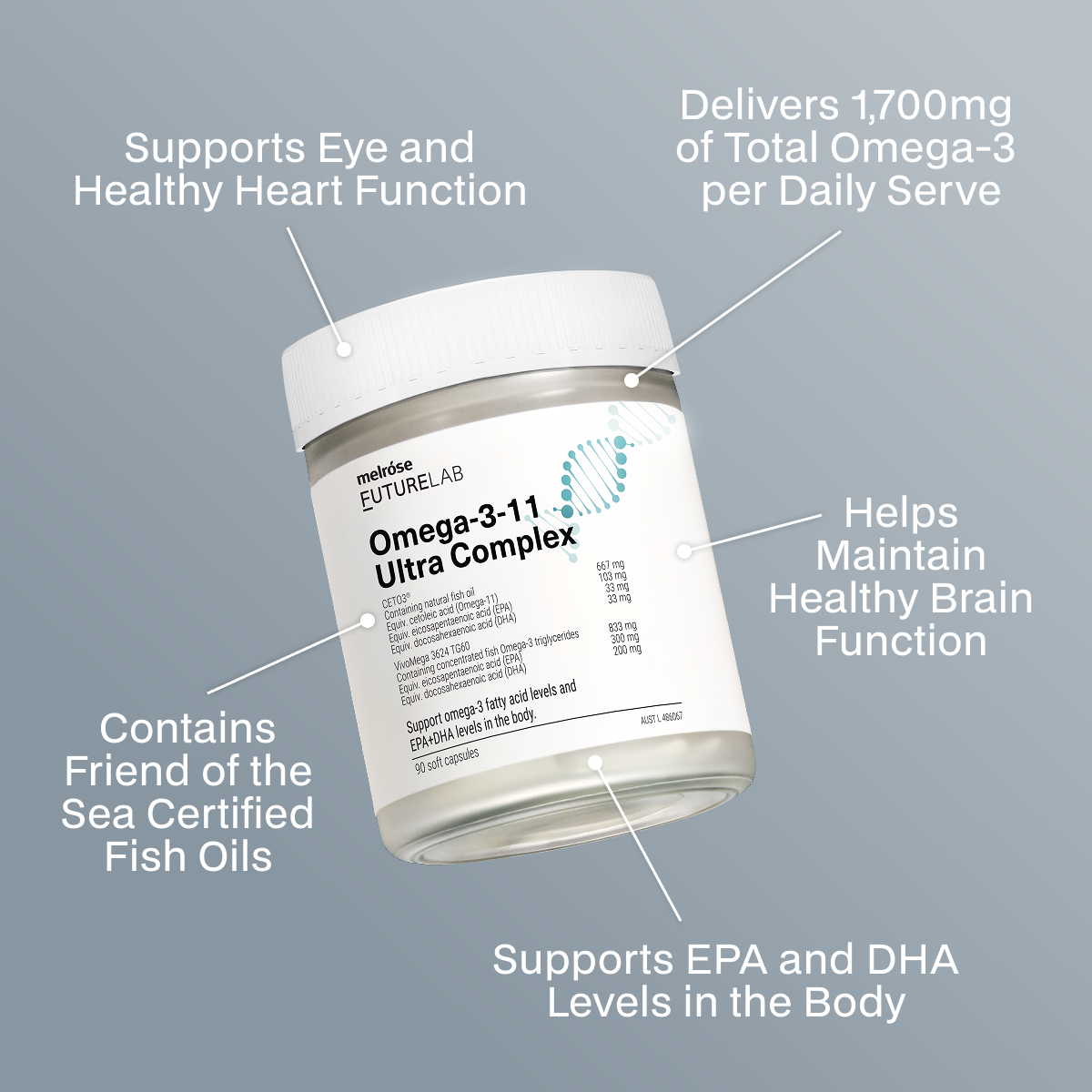 Melrose FutureLab Omega-3-11 Ultra Complex is a breakthrough in omega supplementation. This advanced formula combines a daily dose of 1,700 mg of omega-3s with 309 mg of clinically trialled omega-11 for enhanced health benefits.