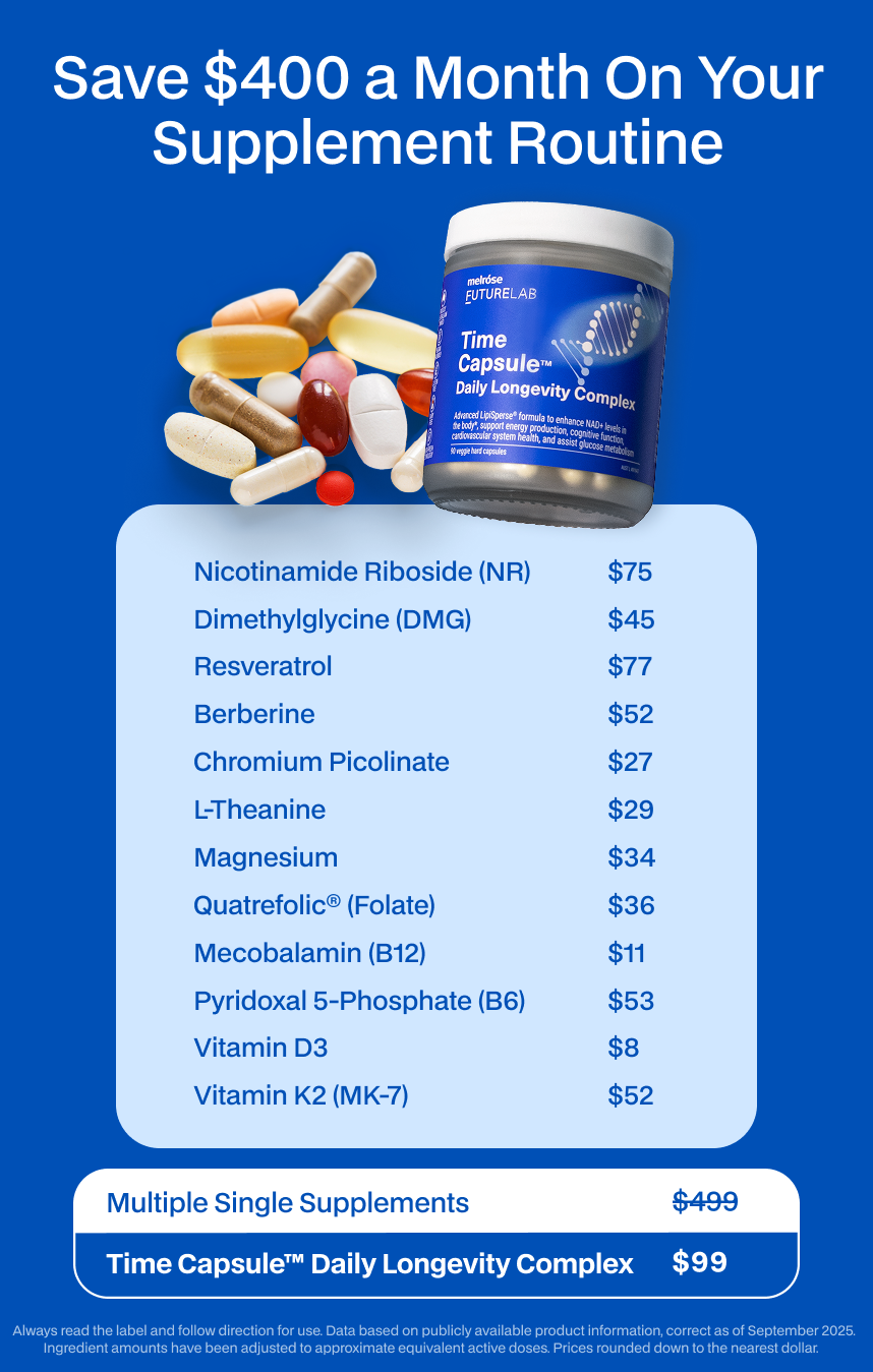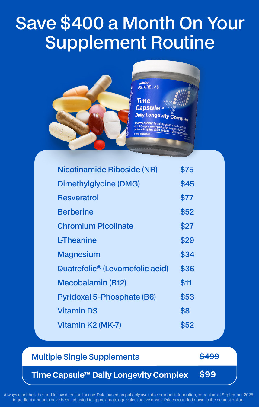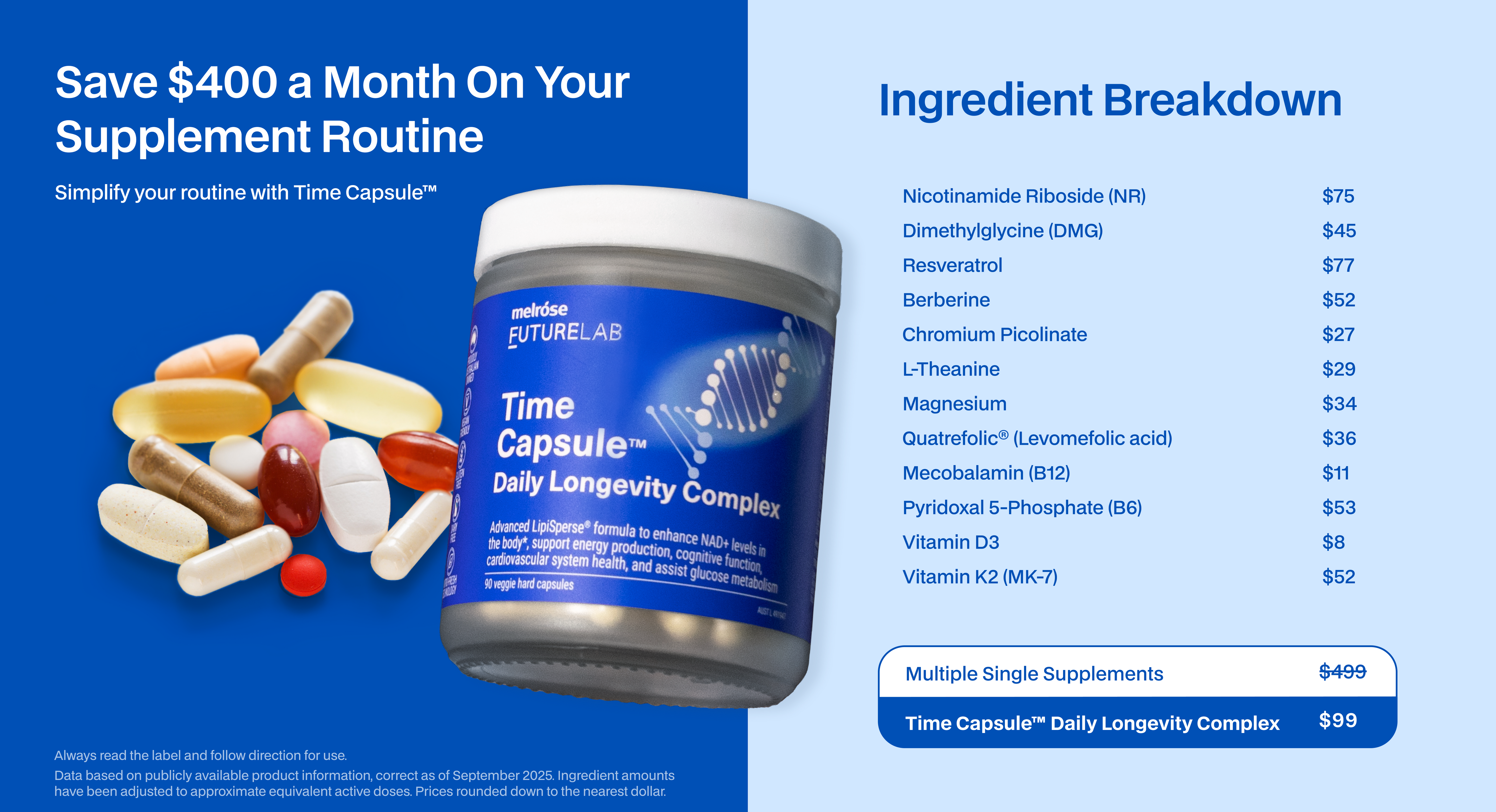 ^All-in-one” refers to the comprehensive nature of the formulation. The recommended daily dose is 3 capsules. FutureLab Time Capsule Daily Longevity Complex combines multiple formulations into one streamlined daily routine.